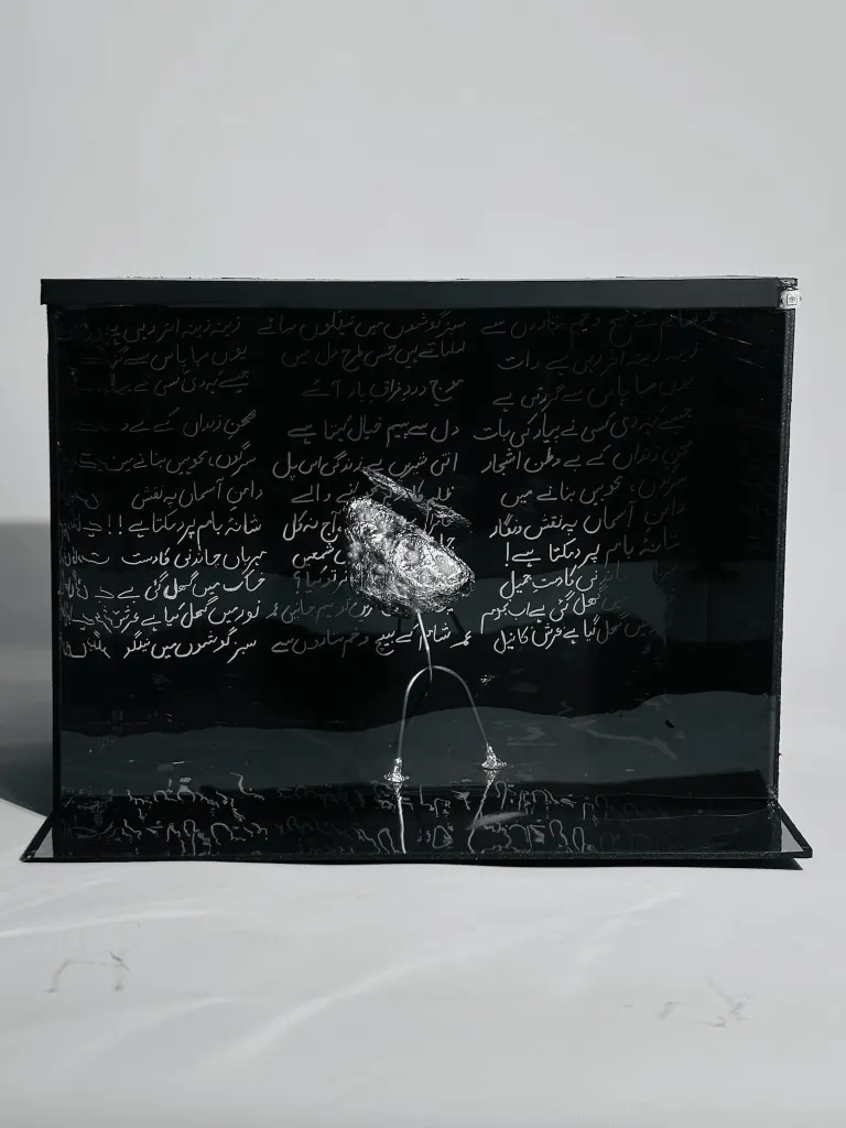 One of the cultural aspects involves poetry, particularly some graceful verses written by Faiz Ahmed Faiz, a distinguished poet from Pakistan who often used lunar imagery in his poetry.Inspired from his poem “Zindan Ki Ek Sham” which he wrote in the shadows of prison, this moon is crafted by using foil, surrounded with lights and accompanied with poetry.This moon embodies hope, strength and love, it is a luminous reminder that even in despair beauty and resilience can blossom.